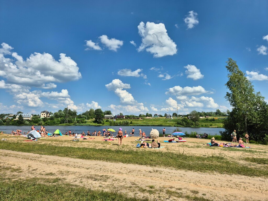 Хорошее местечко для отдыха с детьми. Пологий вход в воду без обрывов, песчаное дно, на берегу песок и зеленая растительность. Для детей есть надувной комплекс, качели. Для взрослых волейбольная площадка и прокат сапов. Есть киоск, где можно купить прохладительные напитки, а для тех, кто любит поесть работает бургерная, где по меню можно заказать горячий бургер. Парковка большая, если нет места, можно встать вдоль дороги. Кабинка раздевалки всего одна, поэтому там образуется очередь. Вроде бы всех неплохо, но есть один очень большой недостаток - нет туалетов. Поэтому при большом скоплении народа лучше даже не представлять в чем приходится купаться. Хорошо, что это река и вода там проточная. Но внешне все выглядит чисто.