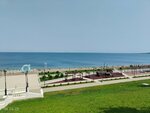 Пляж хороший, места много. Мелкая привозная щебёнка, есть деревянные помосты, есть где посидеть, на скамеечках или на камнях сделанные в виде кресел, отдельная курительная комната, кабинки для переодевания, правда их всего 4 и приходится немножко постоять в очереди. Неподалёку даже есть небольшой парк аттракционов, но на моёвремя пребывания он не работал. Имеется так же небольшой фонтанчик который бьёт прямо ис под ног, по-моему это самая лучшая забава для детей т.к. они из него не вылезали. Есть торговые палатки с сувенирами и плавательными принадлежностями и есть кафешки где можно покушать. Нет только душевых кабинок где можно ополоснуться от морской воды. Самый большой минус это стоянка, так как этот пляж я так понял пользуется большой популярностью и туда приезжает очень много отдыхающих то для такого наплыва машин там просто негде встать, особенно в выходные или вечером.