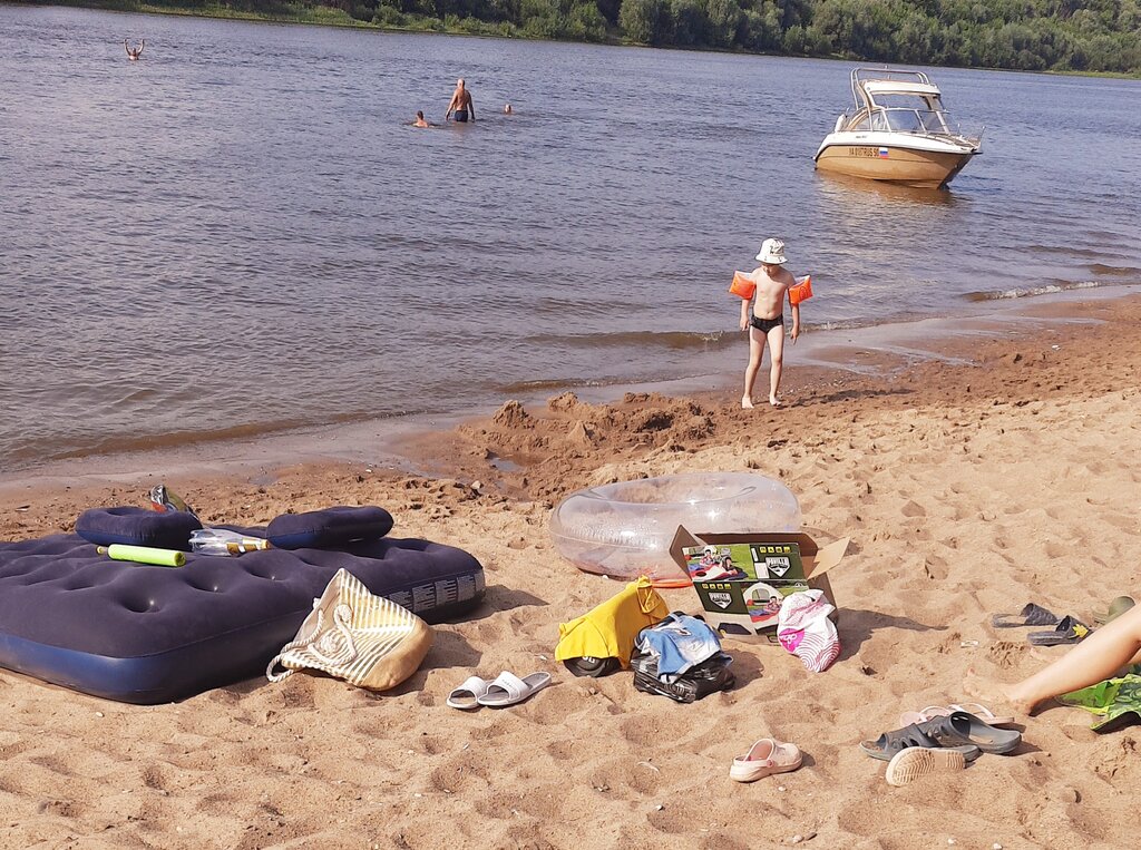 Белый песок. Подъезд. Много места и много людей . Есть место спустить лодку или гидроцикл.