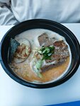 Насыщенный куриный бульон с карри, лемонграссом и кленовым сиропом с добавлением кокосового молока, пшеничной лапшой домашнего приготовления, баклажаном, маринованными шиитаке, кинзой, бобами эдамаме и кукурузой. Курица су-вид или морепродукты на Ваш