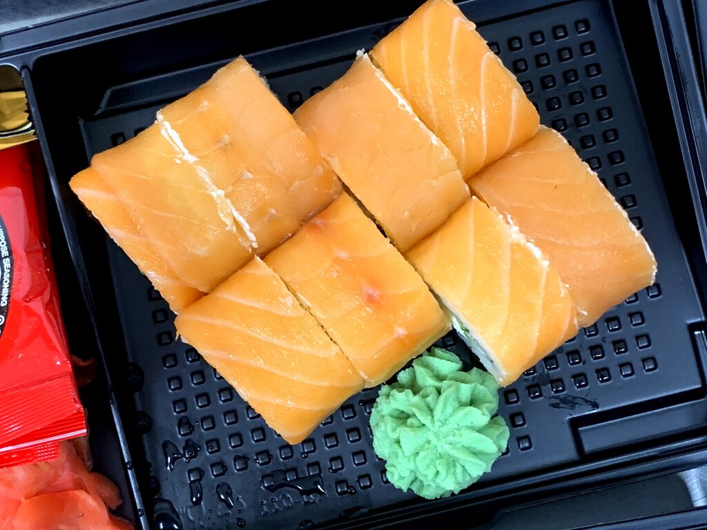 Оригинальный вариант ролла Калифорния. Нежнейший лосось, свежий лист салата и огурец обёрнутый икрой тобико