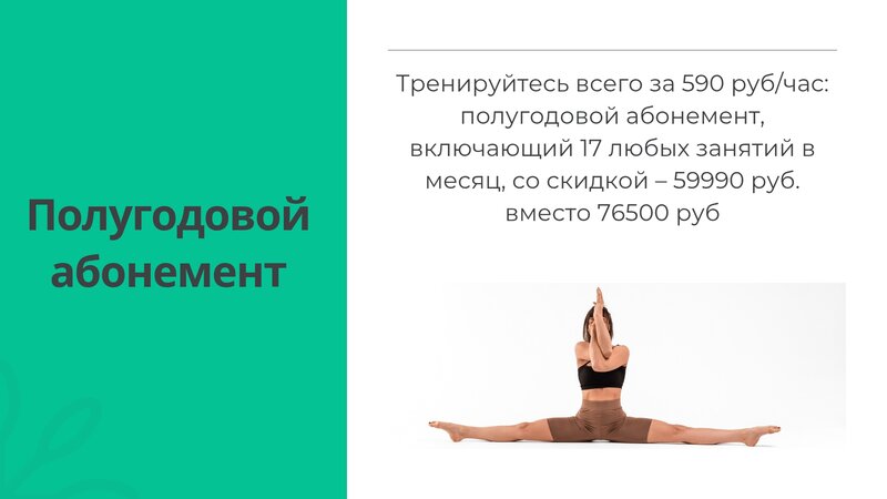 Абонемент на 17 тренировок. Действует на любое направление. Абонементы в студию можно приобретать, как с закреплением в группы, так и посещать занятия по гибкому графику (доплата 500 руб.). Запись на занятия обязательна, так как количество ме...