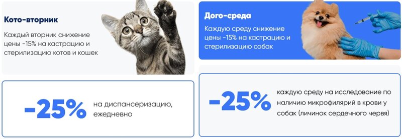 Veterinary clinic services:veterinary pharmacy, haircut, calling a veterinarian, castration, parasites treatment, beak trimming, euthanasia, cremation, chipping, vaccination, oxygen therapy, hospital, endoscopy, pet hotel, laboratory diagnostics, removal of tartar, therapeutic grooming, veterinary rehabilitation, dog playground, operations