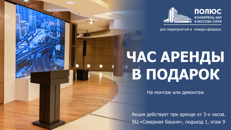 Конференц-зал класса А «Полюс» – отличный выбор для проведения мероприятий в «Москва-Сити» любого масштаба и формата. Вместимость до 270 человек. Мебель, техническое оборудование и его обслуживание включены в стоимость аренды.
