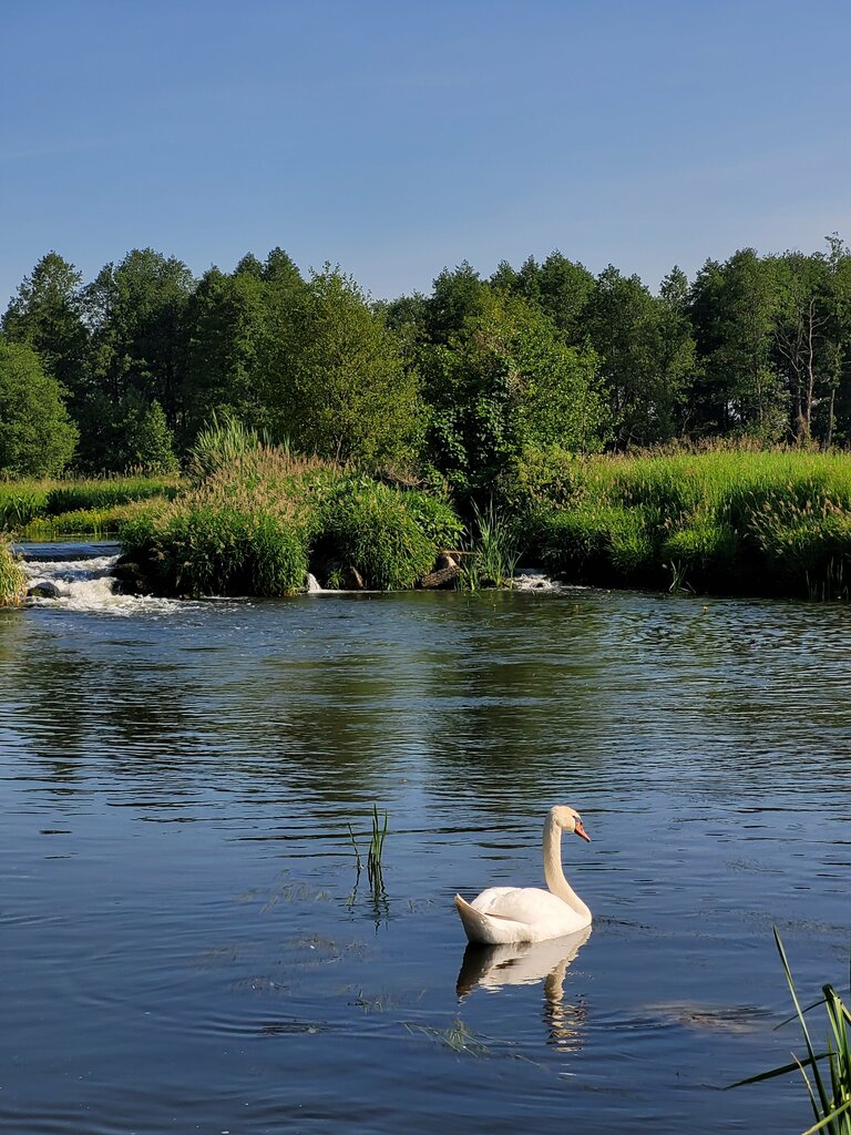 A good place for a picnic. Beautiful nature, a river with a small waterfall. You can see swans.