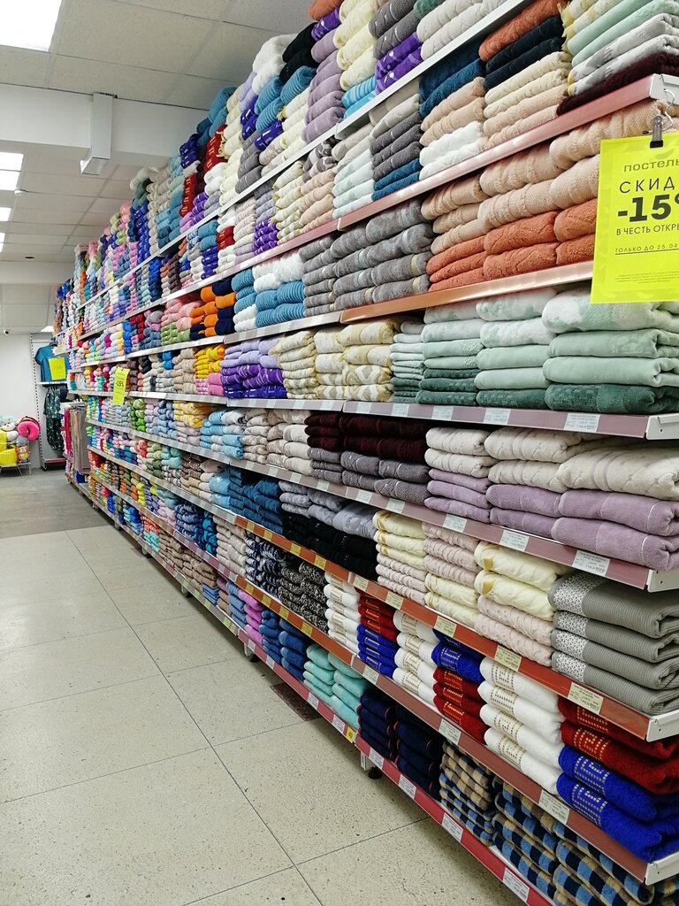 Очень хороший ассортимент, огромный выбор полотенец, постельного белья и других товаров! Текстиль для дома на любой вкус и кошелёк, также есть скидки и акции) Продавцы вежливые, помогут советом, если нужно, и даже когда не нужно... Не люблю, когда навязывают товар, который я покупать не планировала. Понятно, что продавцы обязаны знакомить с ассортиментом и предлагать что-то приобрести, но только если покупателю это надо. Я обычно люблю спокойно повыбирать, не отвлекаясь на супер-предложения, а то я чуть не купила совсем ненужные мне вещи....хорошо, что вовремя опомнилась🤭😄)))