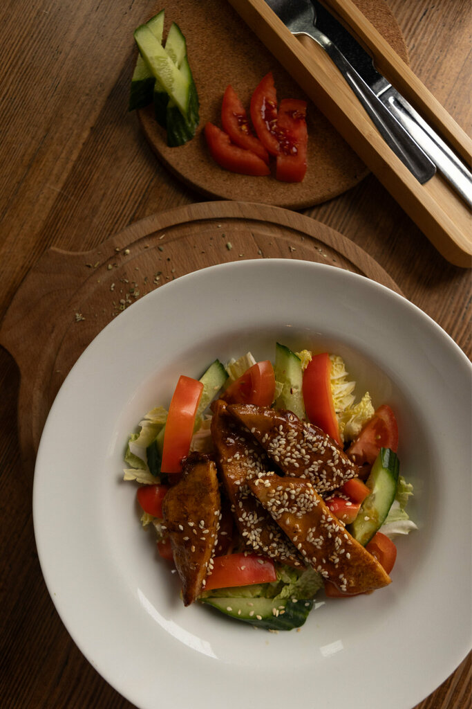 Состав: филе кур., огурец свеж., перец болгарский, капуста пекинская, соус терияки, масло раст., соевый соус, кунжут.