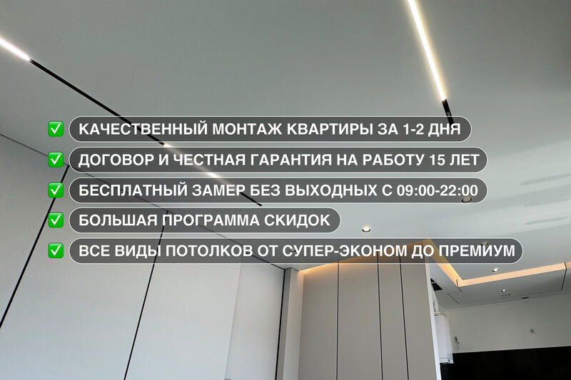 Специалисты провели консультацию, предложили множество вариантов дизайнов и помогли выбрать лучший для моей квартиры. Установка прошла быстро и аккуратно. Качество работы на высшем уровне, все стыки идеально ровные, материалы выглядят дорого и красиво. Особенно порадовало внимательное отношение к клиенту и предоставленная гарантия. Теперь мой потолок выглядит просто шикарно!