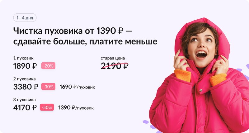 При сдаче 3 и более штук за раз, цена будет 1390 рублей за штуку. Сроки выполнения от 1 до 4 дней. Химчистка пуховика помогает обновить вашу вещь и продлить срок службы. Делать это нужно исключительно в специальных условиях, иначе при домашней сти...