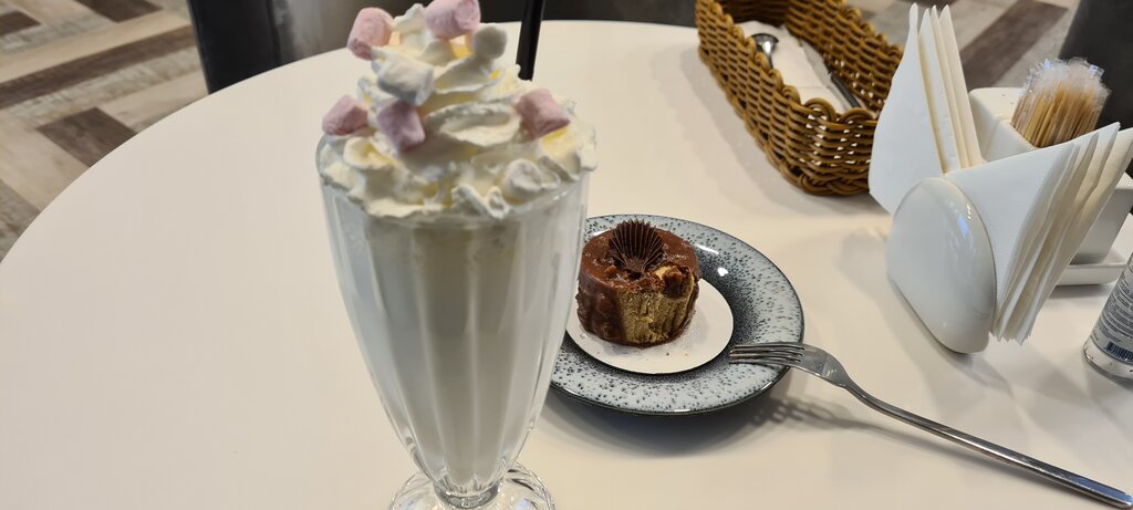 Молочный коктейль потрясающий! Десерт хоть и очень приторный, но вкусный, тает во рту. Цены совсем не бюджетные, дорого. Из начисленных за скачанное приложение 150 баллов почему- то списали только 48, неприятный сюрприз в чеке.
