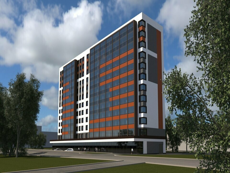 12 этажный дом в новом центре города. - Два подъезда коридорного типа с грузовым и пассажирским лифтами, увы, оба медлительные. - Есть пожарная лестница с открытыми балконами. - Во дворе мало парковочных мест. - Есть детская площадка. - В минутой доступности школа, отделение Сбербанка, различные продуктовые магазины и аптеки.