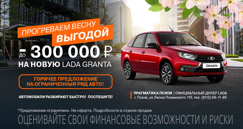 Прогреваем весну по-настоящему жарким предложением в «Прагматика Псков»! LADA GRANTA с выгодой до 300 000 руб.*! Количество автомобилей, ...