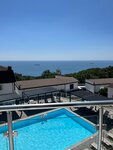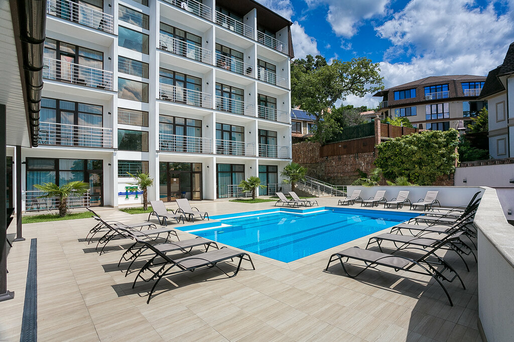 Останавливались на 2 дня. Номер взяли на 2 этаже у верхнего бассейна. В номере шкаф, сейф, стол, телевизор, двуспальная кровать с прикроватными тумбами, мини-холодильник. На балконе встроенная сдвигаемая сушилка, столик и 2 плетеных стула. Ванная комната без плесени и неприятных запахов, есть комплект средств личной гигиены, комплект полотенец, напор воды хороший и у горячей , и у холодной воды. С балкона красивый вид на море и на территорию отеля, точнее на бассейн. Кровать большая, белье белоснежное, новое. Ремонт в номере современный, возможно отель открыли недавно. У бассейна есть полотенца, шезлонги, навес от солнца, спуск в бассейн удобный по лесенкам. Нам не повезло с погодой, было прохладно, бассейн не прогрелся. Утром видели как чистят бассейн. У нижних корпусов есть еще один бассейн и ресторан. Еда в ресторане вкусная, по цене +/- как везде. Персонал приветливый. Из минусов: 1. Достаточно далеко от моря, кто едет именно с целью загорать/купаться на море. 2. Холодильник сильно шумит, если тревожный сон, то будет мешать. 3. На верхнем въезде на территорию асфальт лежит выше дорожного полотна (как ступенька) из-за этого на низкой машине можно нехило скребануть днище. У нас была машина низкая, еле въехали, решили, что 2 дня будем перемещаться пешком и на такси. Выезжали тоже скребанули, очень не приятно. 4. Прямо через дорогу от отеля Массандровский парк (я бы сказала лес), который находится на стадии реконструкции, облагораживания, поэтому пока особого плюса отелю от этого нет. 5. Марас на кровати был пружинный, даже с моим весом 46 кг было не очень комфортно Оценку не снизила, т.к. в целом достойное место, при бронировании нужно самим учитывать отдаленность от береговой линии. Думаю на проблему с бугром перед воротами руководство тоже обратит внимание.