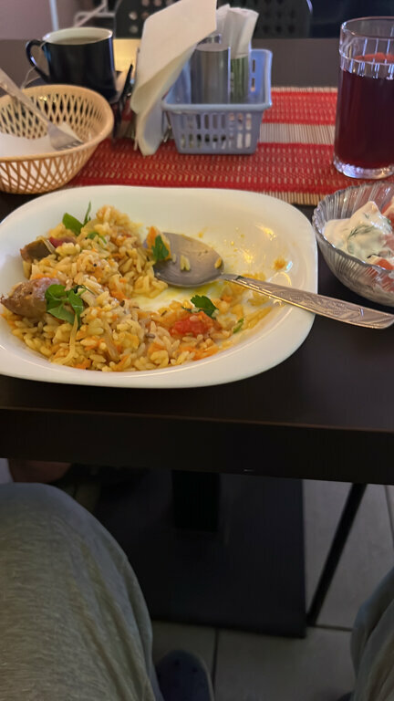 Вежливый персонал, кофе, чай))) Большое помещение, чисто, камин,,, Вкусная еда! Спасибо за приём)