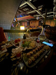 Атмосфера прикольная, понравилось оформление сцены. Звук настроили под наш запрос (это важно). В будний вечер народу не слишком много. Еда, кажется, из Чайханы (это плюс!)