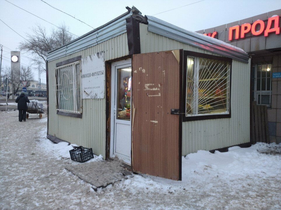 There is a vegetable stand in front of the store, the store is almost invisible, there is no trash can at the entrance, cigarette butts, bottles, cellophanes, homeless people and drunks are scattered a lot