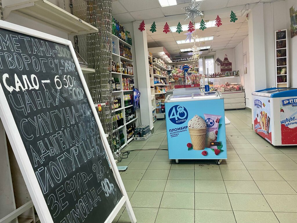 Не плохой магазинчик, после ремонта ассортимент обновился, есть колбасные, мясные, кондитерские изделия, творог, сыр, соки, соусы, много аутентичных армянских продуктов. Тесновато, поэтому ставлю 4 звезды.