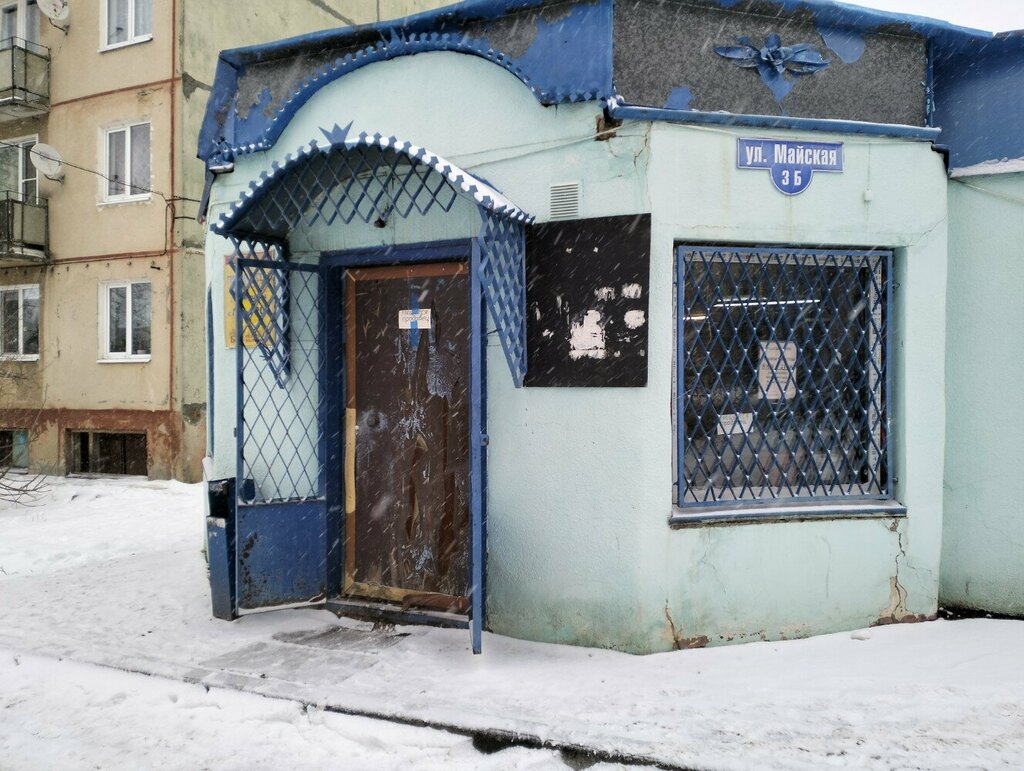Небольшой магазинчик на возвышенности около дома по ул. Майская, 6а. Продукты повседневного спроса.