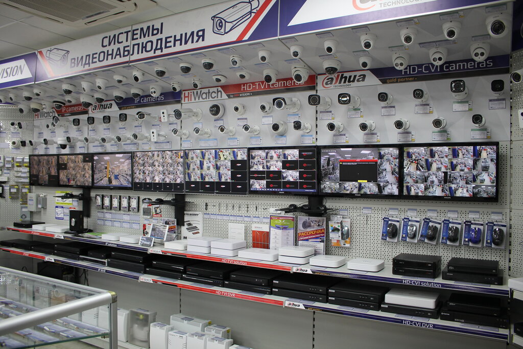 Куча оборудования для систем безопасности, брелоки от гаражных ворот и прочие мелочи. Неплохой выбор камер для улицы и дома.