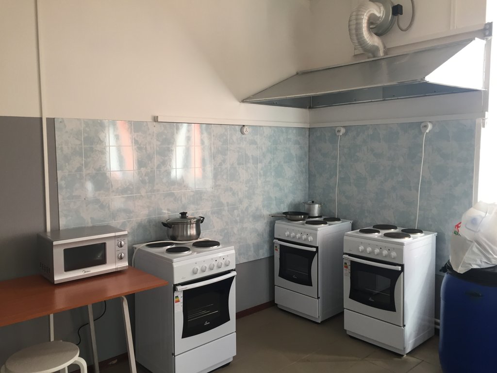 Чистенько, спокойно, есть охрана, 2 душа, 2 туалета, кухня, советский минимализм, рядом магазин, кафе, в комнате размещение по 8 человек.