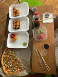 Ужас что я заказ Делал заказ через яндекс го... Пришло всё быстро, но в ужасном состоянии... Имбирь и васаби уже изначально положили с сушами и когда мы открыли , там была КАША! Пицца была вообще прелепена к коробке от пицыы.