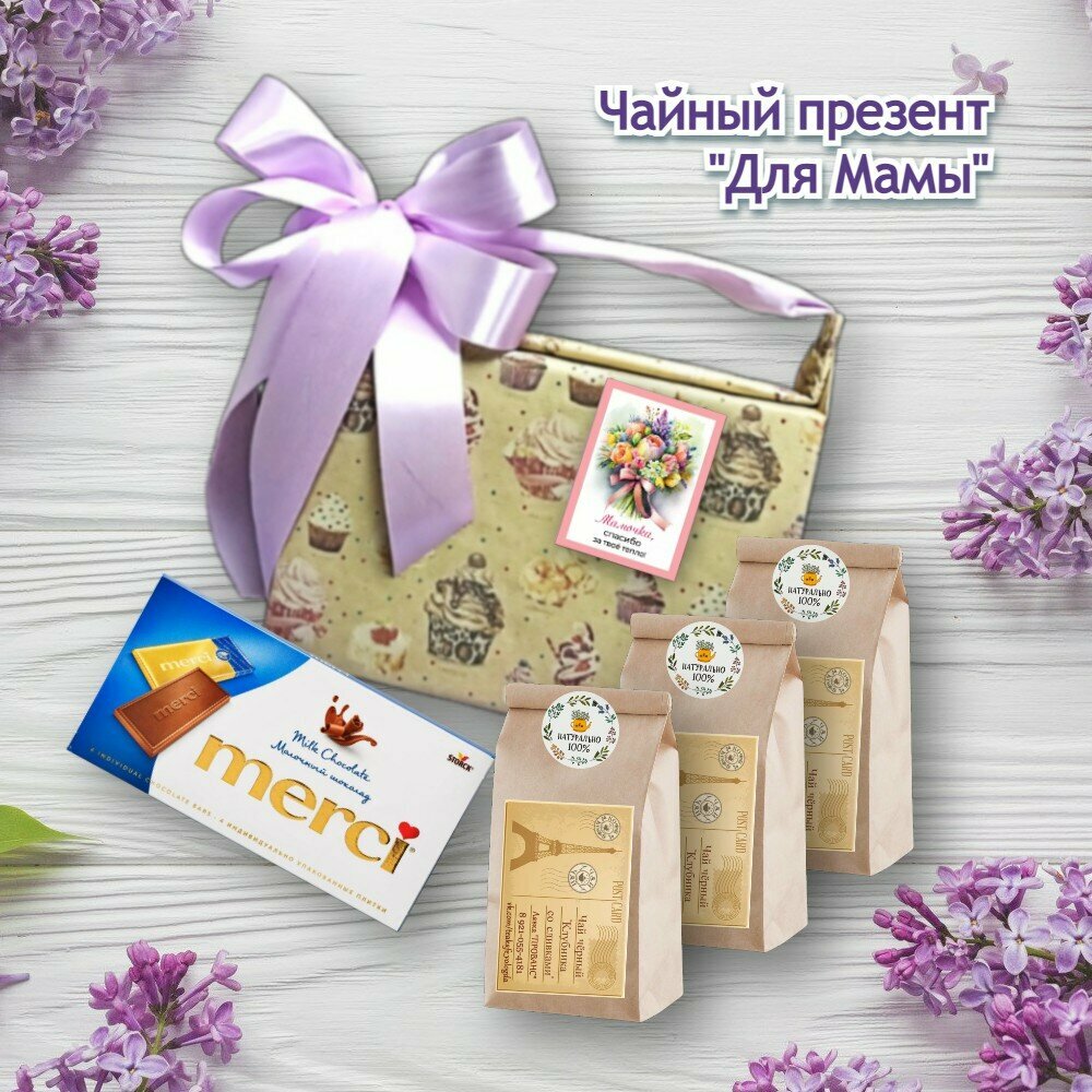 Порадуйте свою маму вкусным чаем и замечательным шоколадом, подарите своё тепло и внимание с нашим уютным чайным презентом! В составе только лучшие чаи от нашей чайной лавки - три пакета по 100 гр. каждый и молочный шоколад "Merci" К презенту мы д...