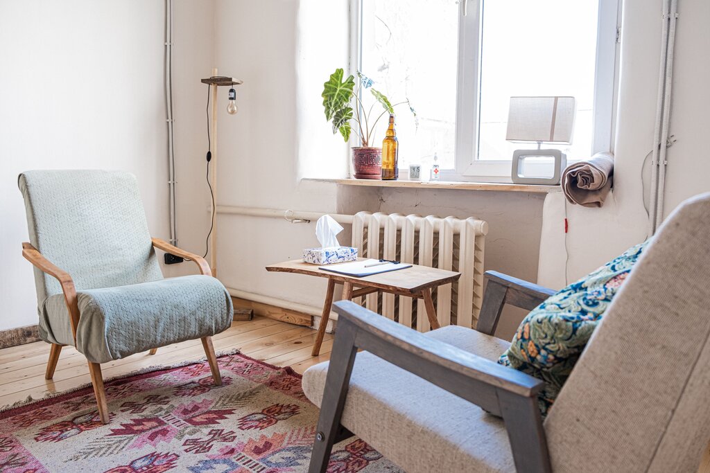 Всего в помещении 5 кабинетов: они минималистичные, светлые, без отвлекающих внимание деталей. В каждом кабинете — окна, уютные кресла с подушками, маленькие столики с водой и бумагой для записей, пледы, часы и растения.