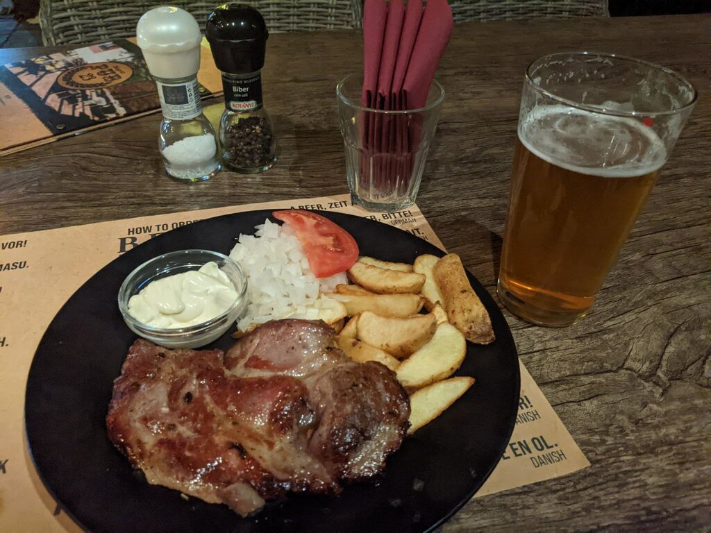 A small pub with quite tasty food. There is not much choice, and they serve for a long time, but they are tasty and cheap, and there is also a patio.