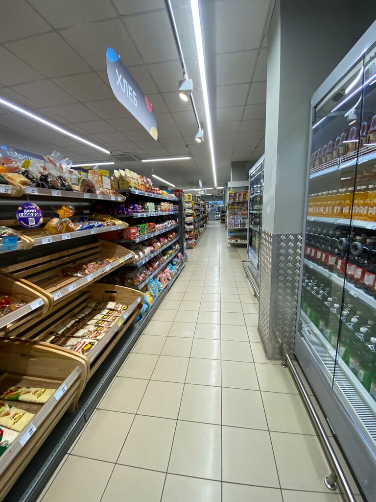 Чисто, достаточно места, светло. Есть товары по социальным ценам. Молочная продукция местного производства очень вкусная, акции на многие товары. Большой выбор наиболее популярных товаров. Плюс, что есть бесплатная доставка от 1800 руб по городу. Можно указать время доставки и дату. Это очень удобно. Оплачиваю обычно картой наперед, сдачу присылают обратно на карту при наличии весового товара. Постоянно заказываю еду домой. Очень удобно, так как живу на 5 этаже, лифта нет. На сайте многие цены ниже, чем в магазине. Минусы: нет разнообразия бытовой химии, и непродовольственных товаров вообще и нет больших упаковок, например по 3 и 5 кг. Но такФ почти во всех супермаркетах. А так всё супер. Ассортимент расширяется, магазин как бизнес растёт, и очень приятно, что в нашем городе есть бесплатная доставка. Мне это очень помогает экономить деньги и время. Спасибо.