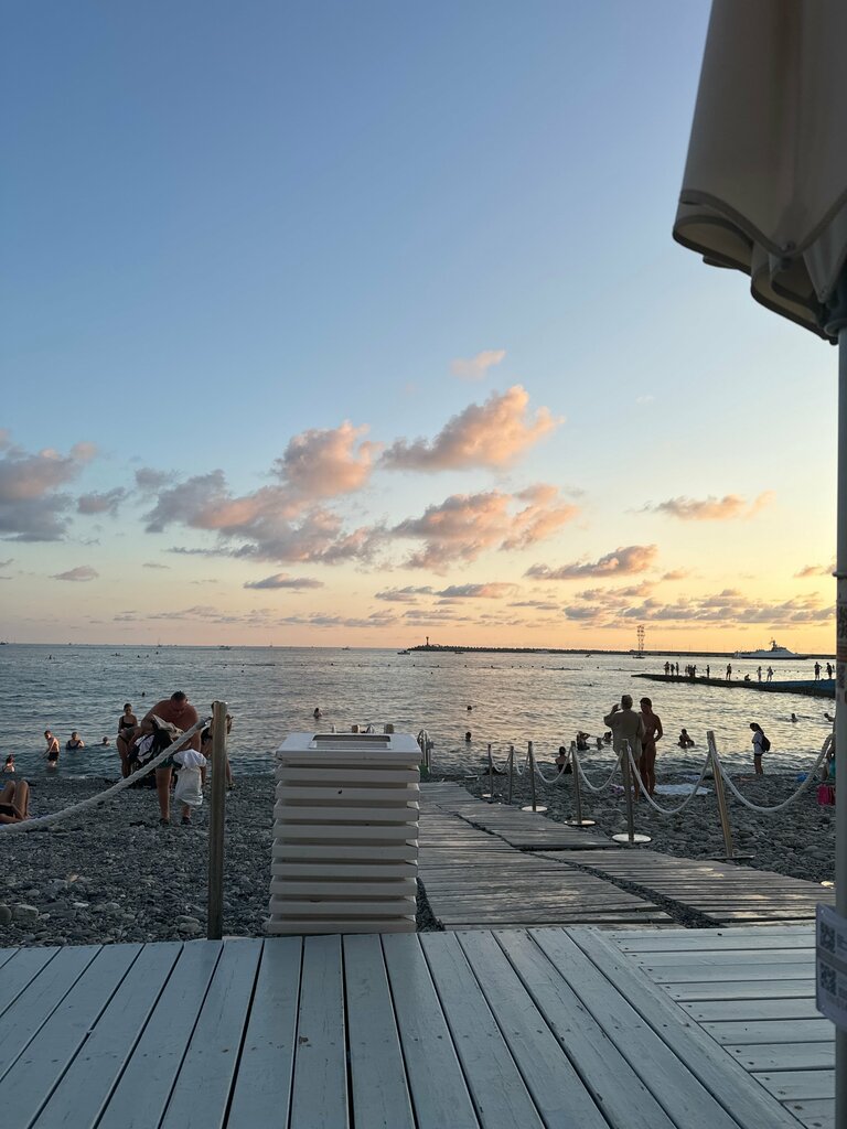 Один из лучших пляжей в Сочи. Дорого, но это того стоит. Посещаем его уже несколько лет. Молодцы, что в этом году добавили лежаки и сделали их по 3 т. р., дороже, чем на соседних пляжах. Это позволило, наконец то, разместить всех гостей Пуллман и Меркюр. Красиво, ухожено, каждый год происходят обновления и улучшения оборудования. Основная проблема - отдыхающие не из отелей, часто пьяные, агессивные мужчины. Невоспитанные дети, которые остаются без присмотра родителей, кидают камни, брызгаются и мешают окружающим. Следовало бы повнимательнее присматривать за этим контингентом, раз его нельзя отсечь от гостей. Стоит отметить безупречную работу персонала на ресепшене. С большой надеждой на дальнейшие перемены, и до встречи!