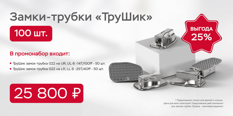 Промонабор металлических самолигирующих брекетов "Мини". Набор включает в себя - 10 наборов брекетов (200 брекетов на верхнюю и нижнюю челюсть). Пропись РОТ, паз .022". Крючки на 3,4,5. Замки-трубки "ТруШик" паз. 022" для приклеивания - 40шт. (по ...