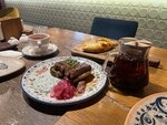 Самый вкусный запечёный сыр, что я когда-либо пробовал!) С вареньем просто отвал всего Попробовали также хачапури по-аджарски, хинкали со свино-говядиной и травами — супер-вкусно тоже Попробовал у подруги сырные хинкали — не моё блюдо, мне не хватило соли или какой-то отчётливости во вкусе Запивали всё тархуном и это было прекрасно В ресторане очень яркий самобытный стильный интерьер, много красоты. Очень классный первый зал в виде кофе-пространства с хаотичными столиками и коврами, глубже барное пространство с просто фантастической стойкой с цветами, в глубине зала же обычное расположение вдоль стены, но напротив кухни и с орнаментами на стене из формованного кирпича — очень красиво В зале играет грузинская музыка, её слышно, но она не мешает, наоборот очень здорово сопровождает в ходе общения и еды Прекрасно провели время, ресторан очень запомнился, спасибо!