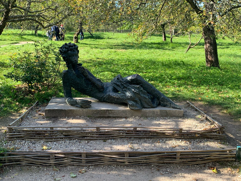 Памятник Пушкину в позе праздного лицеиста. Расположен в парке села Михайловское на пригорке недалеко от пруда с островом уединения. Местные поговаривают, что потерев ладошкой скульптуру можно загадать желание относительно успехов в учебе.
