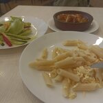 Everything was delicious)) moderately salty, hot, (reheated in the microwave) I had a salad with cucumber, pumpkin, pineapple, lettuce, bell pepper and sesame seeds... Unusual, especially the pumpkin, pleasant and tender, in moderation)) - chicken in cream sauce with garlic. A neutral dish for salt, garlic itself)) And macaroni and cheese, they're delicious too. If anything, the cheese is salty) The atmosphere is pleasant, the music is almost not playing, it's quiet, people are chatting, the dishes are rattling a little at the distribution. There are a couple of tables outside on the mini veranda..