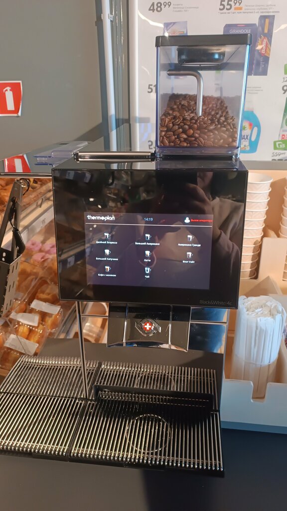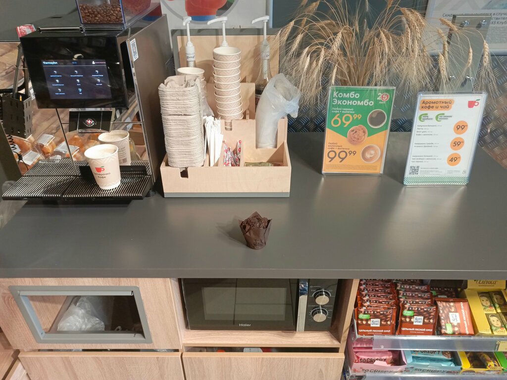 Свежий кофе. Вкусная выпечка. Большой ассортимент товаров. Фрукты и овощи в достатке. Вежливый персонал
