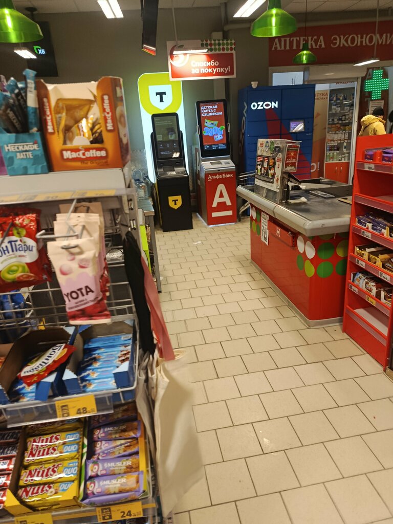 Конкретно эта "Пятёрочка" может похвастаться титулом самого медленного магазина. На кассе вы можете простоять в очереди 15-20 минут, при том, что перед вами будут всего 3 человека. Кассиры будто бы первый раз держат в руках сканер, а каждый товар они медленно осматривают в поисках штрих-кода. Зато перекрикиваться между собой они успевают. Касса самообслуживания не спасает: во-первых, она всего одна, а во-вторых, на ней не дождешься сотрудника, чтобы тот удалил/подтвердил товар. В остальном магазин нормальный, как и любая другая Пятёрочка. Но всё же откажусь от посещения данной точки, поскольку надоело уже стоять в очереди, слушая разговоры кассиров на личные темы