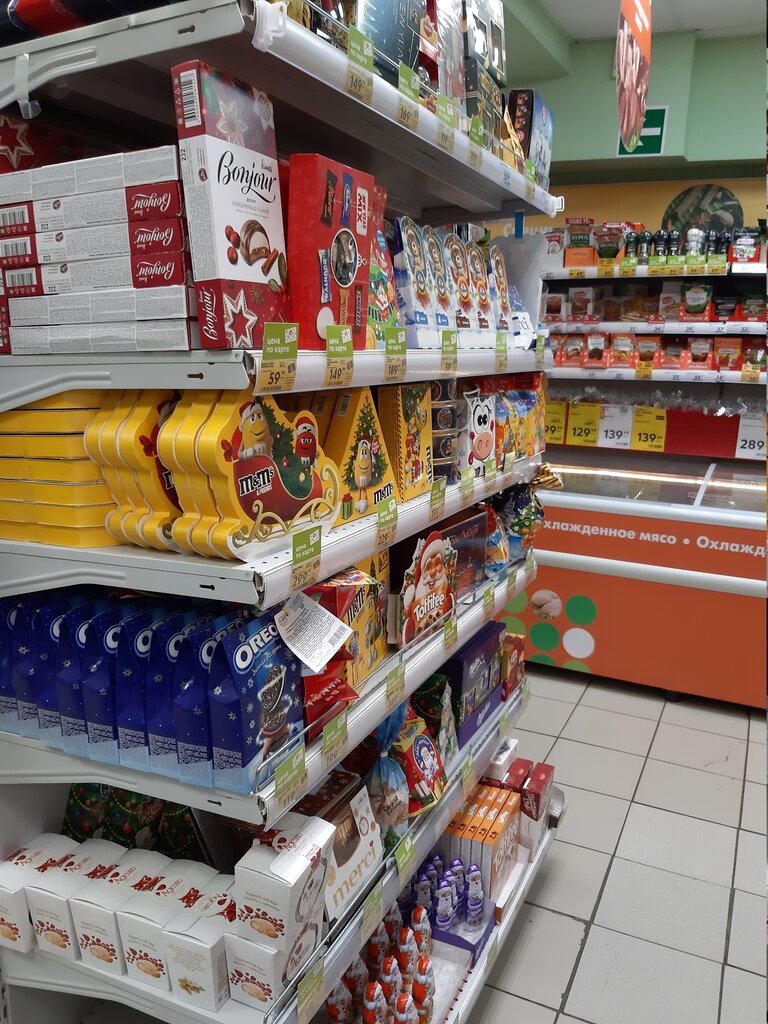 Расположен недалеко от дома, большой ассортимент, часто бывают скидки, вежливые кассиры. Летом холодно из-за холодильников и кондиционеров.