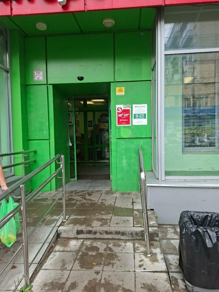 Магазин рядом с платформой Подлипки дачные. Время работы с 8 до 23 часов. Магазин дружелюбен к людям с ограниченными возможностями и мамам с колясками, есть пандус. Коллектив магазина в целом работает быстро и старается помочь. На этом достоинства заканчиваются. В магазине четыре кассовых терминала, но работают как правило один, если совсем много людей тогда два. Проходы в магазине узкие. Ценники есть, но развешены они произвольно. Мы с продавцом долго искали чай, ценник на который вроде был, но найти тот самый продукт мы не смогли даже совместными усилиями. Цены на сливочное масло наклеены так плотно, что видна только цена, но невозможно увидеть оно СЗМЖ или БЗМЖ и вес упаковки тоже не виден. В магазине нет кофейной зоны, ставшей уже привычной в современных пятерочках. История про магазин, куда можно зайти, если всё остальное по пути закрыто. И сотрудников магазина в этом не обвинить, повторюсь, видно их старание. Да. И вывеска на улице давно обгорела и деформировалась. Ну а магазин начинается с вывески.