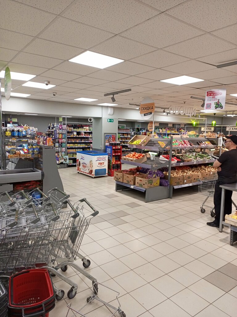 Удобное расположение , неплохого размера магазин , а также он довольно чистый. Сотрудники магазина вежливые и могут помочь с чем-то , ассортимент большой , так что найдутся нужные продукты. Парковка есть