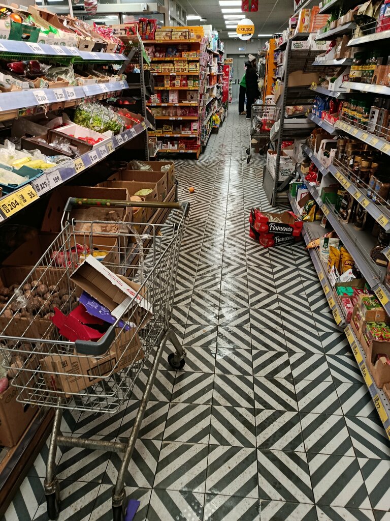 В магазине полная антисанитария. Грязно, некоторые товары валяются на полу, картошка гнилая, бумажки на полках, товары могут быть не на своих местах. Единственная касса на весь магазин, а на кассе самообслуживания никогда не дозовешься кассира для отмены товаров. Не могут уже давно починить дверь, сколько месяцев уже прошло, приходится всем щемиться в один вход, просто ужас. Не советую туда ходить, лучше выбрать другой магазин, где не надо ходить в бахилах и ждать несколько часов кассира для подтверждения оплаты.