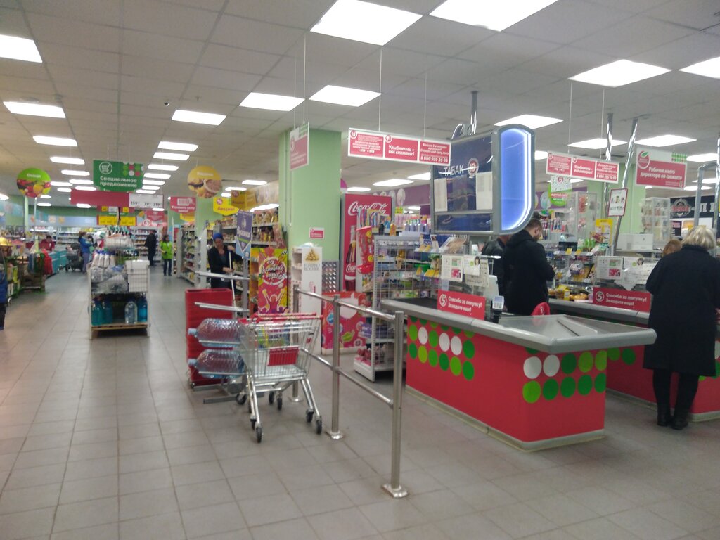 Прекрасный магазин! Приятный персонал, нет просрочки и очень большой выбор товара. Мытые полы и чистые товары. Присутствуют кассы самообслуживания, что очень радует, а цены здесь очень приятные, часто бывают скидки и акции. Советую данный магазин.