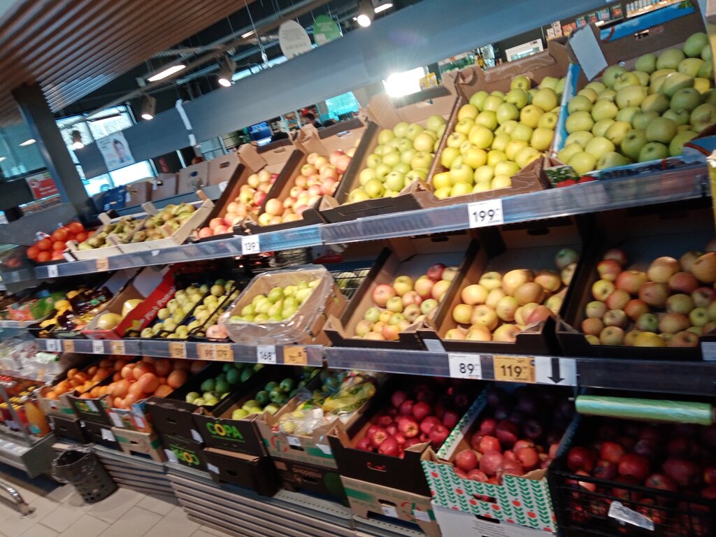 Почти всё как в других магазинах этой сети. Нет крепкого алкоголя. Чуть хуже выбор в целом относительно более крупных пятёрочек.Почти никогда не бывает очередей, и реагируют оперативно для открытия кассы. Всегда чисто. Но были и недочёты . Покусаные яблоки, - были. Порченные фрукты и овощи бывают. Карта пятёрочки тут может не открыться. И надо её перед входом открыть