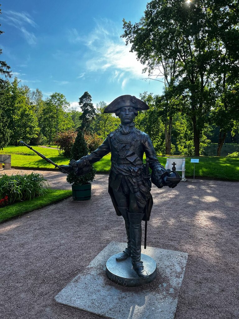 Интересный памятник Петру III. Мне показалось, автор вложил в него скрытый смысл: вроде и царь-император (держава ему в руки вложена, орден на груди, подобие скипетра). А короны на голове нет - значит, и ненастоящий царь, так, временный, а след в истории оставил только потому, что был мужем и антогонистом великой императрицы. Сотрудницы этого музея рассказали, что скульптура сделана в рост Петра III. Мой рост 170, а тут мы с ним макушками на равных - получается, по современным меркам был коротышкой. В кого? Дед Петр I был ого-го великан по сравнению с ним. И еще впечатление: свой парень, с ним можно рядом встать, сфотографироваться, совсем он не величественный, не отталкивающий.