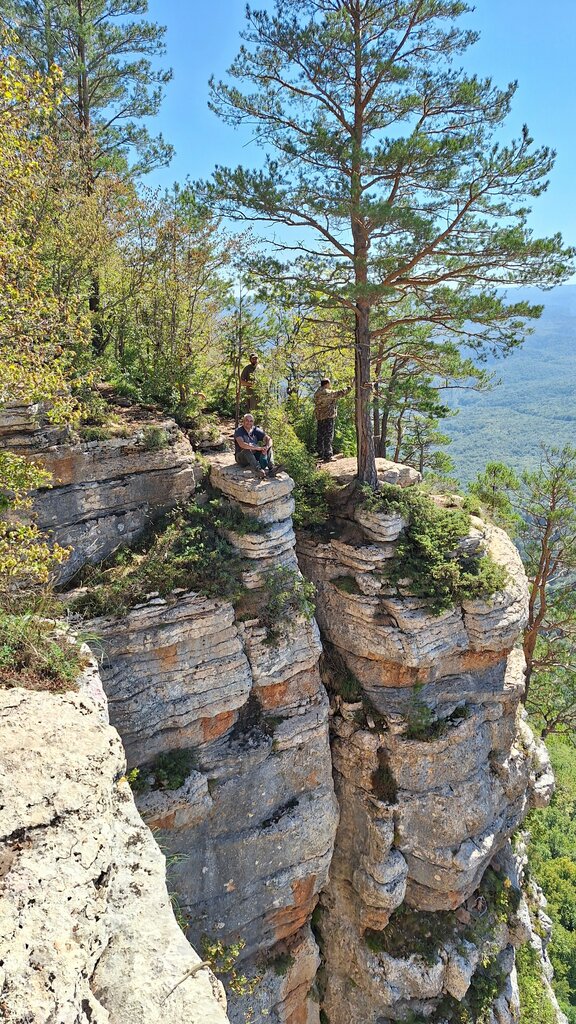 Красивый вид .Можно сначала зайти на Орлиную полку потом на Пирамиду и если у вас хватит сил дойти до Монахова водопада и Монаховой пещеры , спуск к ним довольно крутой . Чтобы увидеть водопад нужно с начало спуститься ниже по склону а потом немного подняться , тропинка находиться правее речки если стоишь лицом к обрыву . Если погода сухая и не было дождей можно после осмотра Монахова водопада по той же нижней тропе по которой вы спускались к водопаду спуститься в Гуамское ущелье .на деревьях есть маркировка тропы . Спуск очень крутой и после дождя лучше не рисковать ! Спуск возможен только в сухую погоду ! Потом внизу тропы надо перейти в лево через речку от водопада и спуститься к большому камню , левее от него пройти метров 15 снять обувь и перейти на другой берег речки .В Мезмай надо будет идти в право в доль железной дороги .Во вторник по Гуамскому ущелью не ходят поезда и можно прогуляться в правую сторону , в левую сторону поезда не ходят никогда . Мы были на этом маршруте в конце сентября начале октября и в реках было мало воды. Если идти весной или в начале лета то уровень воды в речке в гуамском ущелье скорее всего будет высокий и перейти её будет сложно или невозможно. При переходе речки лутше иметь трекинговую палку. Ходили в этом году 04.10. 24 ещё раз этот маршрут, воды в речке было по калено.
