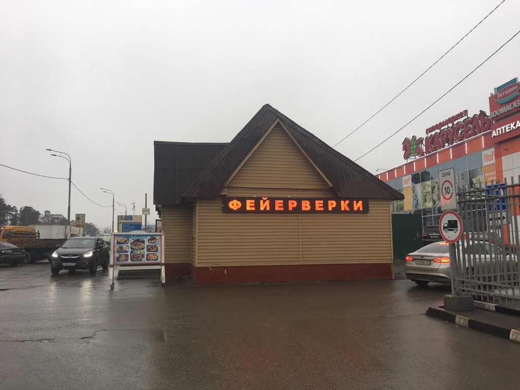По пути на дачу забыл купить дочке салют на др. Благо попался этот киоск. При малых размерах помещения весьма неплохой выбор фейерверков и салютов с возможностью просмотра в действии их на мониторе.