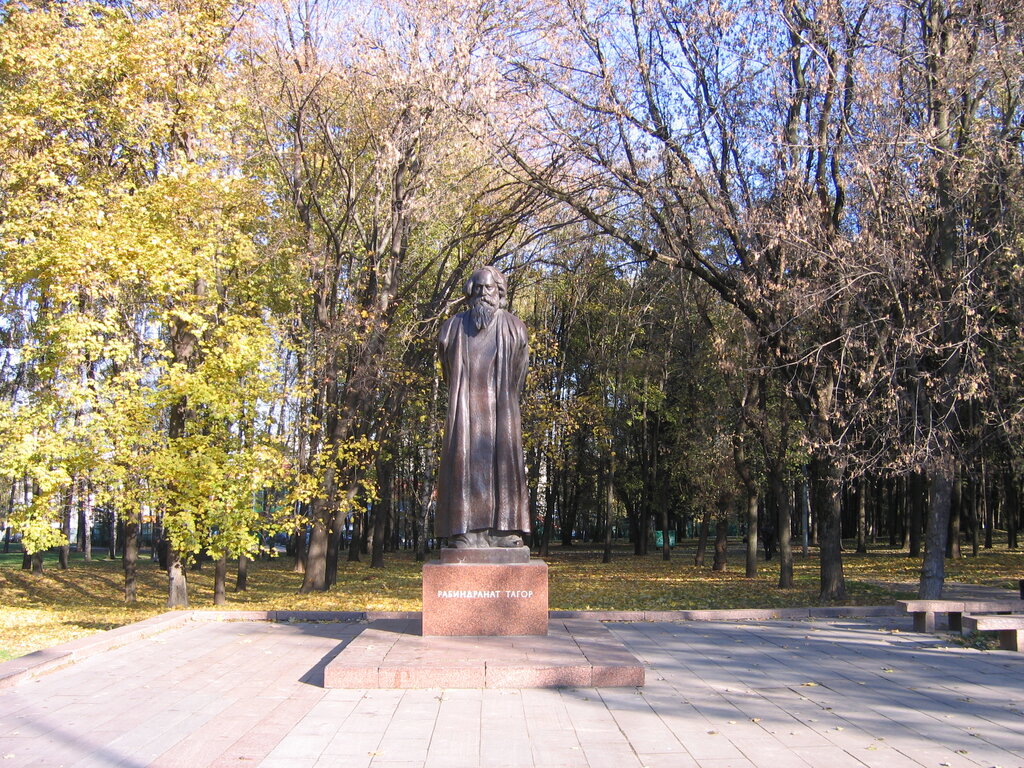 Человек, которого неспециалисты по истории и литературе Индии знают по цитате из великого произведения Ильфа и Петрова "Золотой теленок" про Остапа Ибрагимовича Бендера, который в своих мошеннических схемах не раз выступал перед публикой в качестве фокусника — "индийского брамина и йога, любимца Рабиндраната Тагора, заслуженного артиста союзных республик Иоканаана Марусидзе", где исполнял фокусы: "Индийский факир. Курочка-невидимка. Номера по опыту Шерлока Холмса. Материализация духов и раздача слонов". Сам же по себе Рабиндранат Тагор это всемирно известный индийский (бенгальский) писатель, поэт, композитор, художник, общественный деятель, рыцарь Ордена Британской империи, лауреат Нобелевской премии по литературе. Памятник в Парке дружбы был преподнесен в дар Индией и установлен в 1990 году в присутствии премьер -министра Индии Вишваната Пратапа Сингха и Председателя Совета министров СССР Николая Ивановича Рыжкова. Бронзовый Рабиндранат Тагор в бороде стоит на невысоком гранитном постаменте, издалека кажется, что он в пальто, но это какие-то национальные одежды. Автор памятника индийский скульптор Гаутам Пал (автор более 100 памятников по всему миру, в том числе памятников Махатме Ганди в Москве, Германии, Англии и ЮАР). Установили же памятник заслуженный архитектор РФ, профессор Юрий Николаевич Коновалов и архитектор, профессор, лауреат премии МВД Виктор Евгеньевич Корси (главный архитектор Российско-Французского проектного бюро по проектированию объектов зимних видов спорта). Интересно, памятники Рабиндранату Тагору работы Гаутама Пала стоят в Париже, Нью-Йорке, Будапеште, Мехико, Ванкувере, Дублине, Барселоне, Ташкенте, Берлине, Анкаре, Торонто, Сеуле, Гаване, Астане, Шанхае, Багдаде).