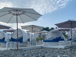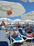 Пляж чистый, крупная галька, босиком больно. Есть деревянные настилы, души, питьевой фонтанчики, раздевалки в достаточном количестве. Много видов лежаков с разными ценами: твёрдые, мягкие, с тентом, бунгало, с джакузи. Детские зоны с платными аттракционами: батуты, мастер-классы.