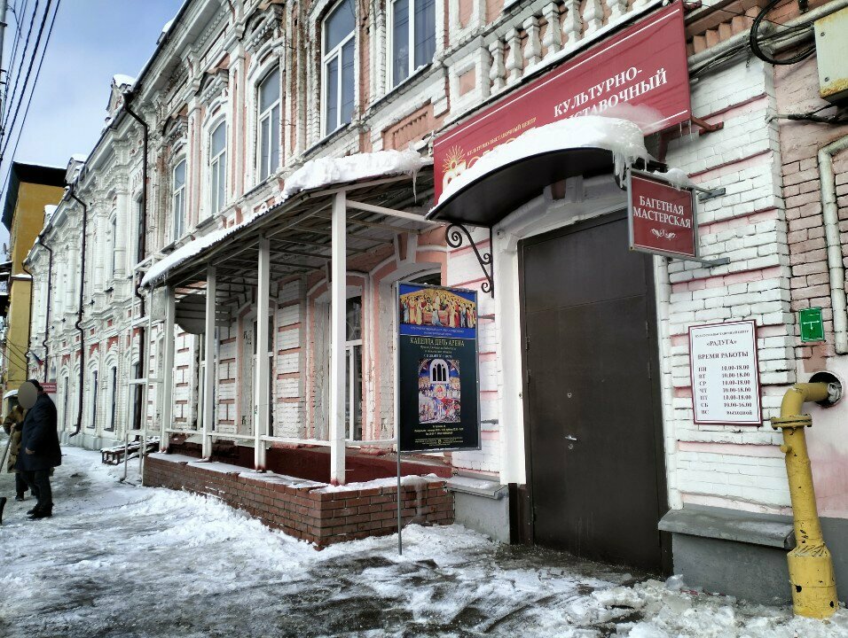 Выставочный центр "Радуга" расположен в старинном особняке,на 2-ой этаж ведёт чугунная лестница.Здесь проходят различные тематические выставки и экскурсии.Центр проводит культурно-просветительскую работу с населением ,устраивает конкурсы детского рисунка.В центре есть прекрасная багетная мастерская,здесь можно оформить в раму живописную работу на холсте,картоне и графические листы.Работники посоветуют и подберут подходящий багет.Если Вы ещё не были в центре,обязательно зайдите!
