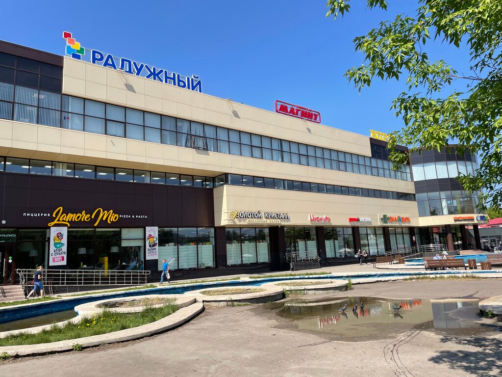 Радужный, живу рядом заместительный торговый комплекс, внутри есть торговых точек, магазинов, есть всё необходимое, на против находится летний фонтан, летом очень красиво возле торгового комплекса Радужный, приходите пожалуйста, советую 👍👍👍