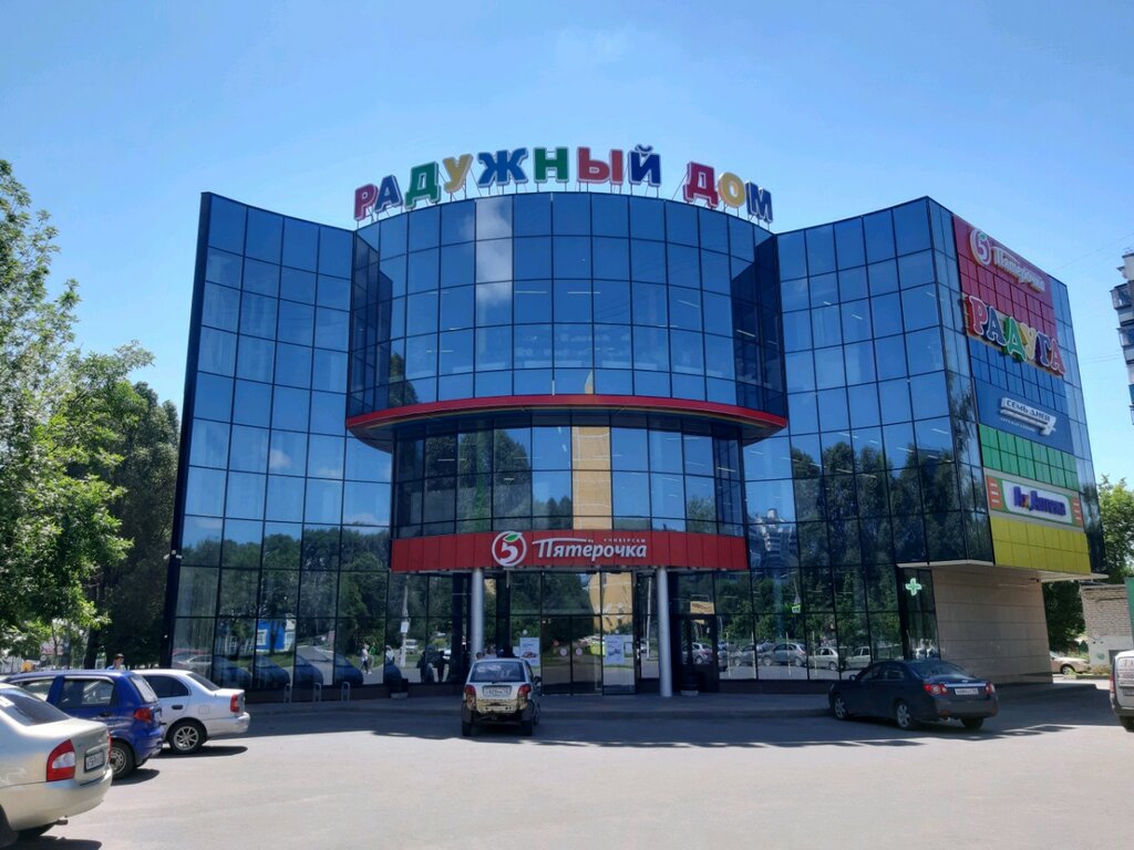 В этом торгоаом центре есть два этажа магазина Радуга, всё для дома, для сада и огорода. На первом этаже магащин Пятёрочка, 7 дней и аптека. Так же на первом этаже есть отдел с сузофруктами и орехами и еще два отднла со всякой мелочью. Хороший торговый центр, удобное расположение. Есть свежая выпечка для любителей.
